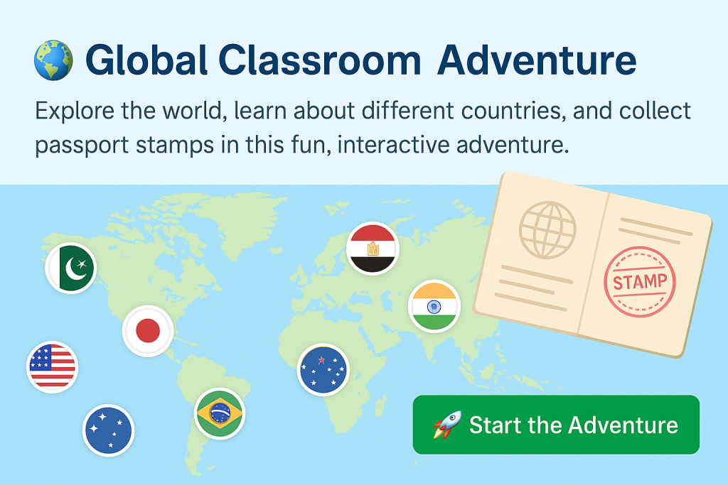 Explore the world, learn about different countries, and collect passport stamps as you travel through this fun, interactive adventure. Click below to start your journey!